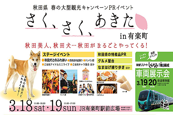 今世界的に話題の「秋田犬」とのふれあいや西馬音内盆踊りなどのステージイベントの他秋田ならではの特産品やグルメ屋台の出店、もちろん我らが"なまはげ"も会場内を練り歩きます!!! JR有楽町駅前広場が秋田色に染まります!! 皆さまどうぞお立ち寄りください(^o^)/